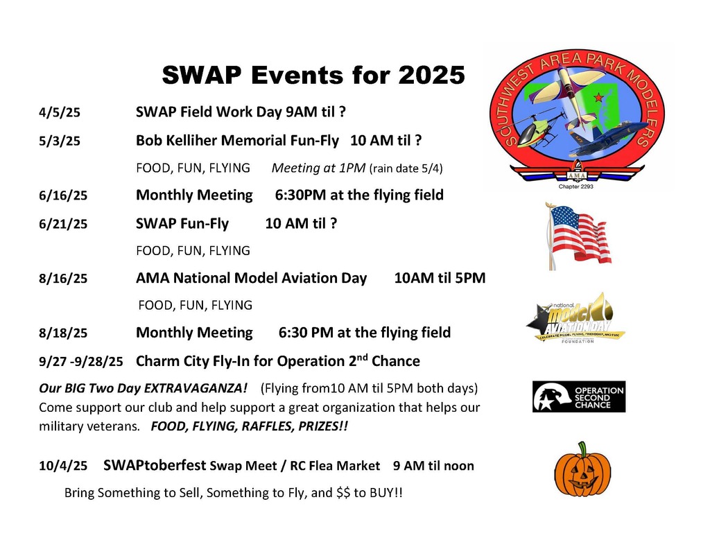 Our club (the SWAP Modelers) is an organization of enthusiasts dedicated to promoting the development of radio-controlled modeling as a recreational, sporting, and educational activity. It is also our goal to encourage brotherhood among the present and future members of the club and the community; and to aid the programs of the Baltimore Highlands Recreation Council and the Academy of Model Aeronautics.